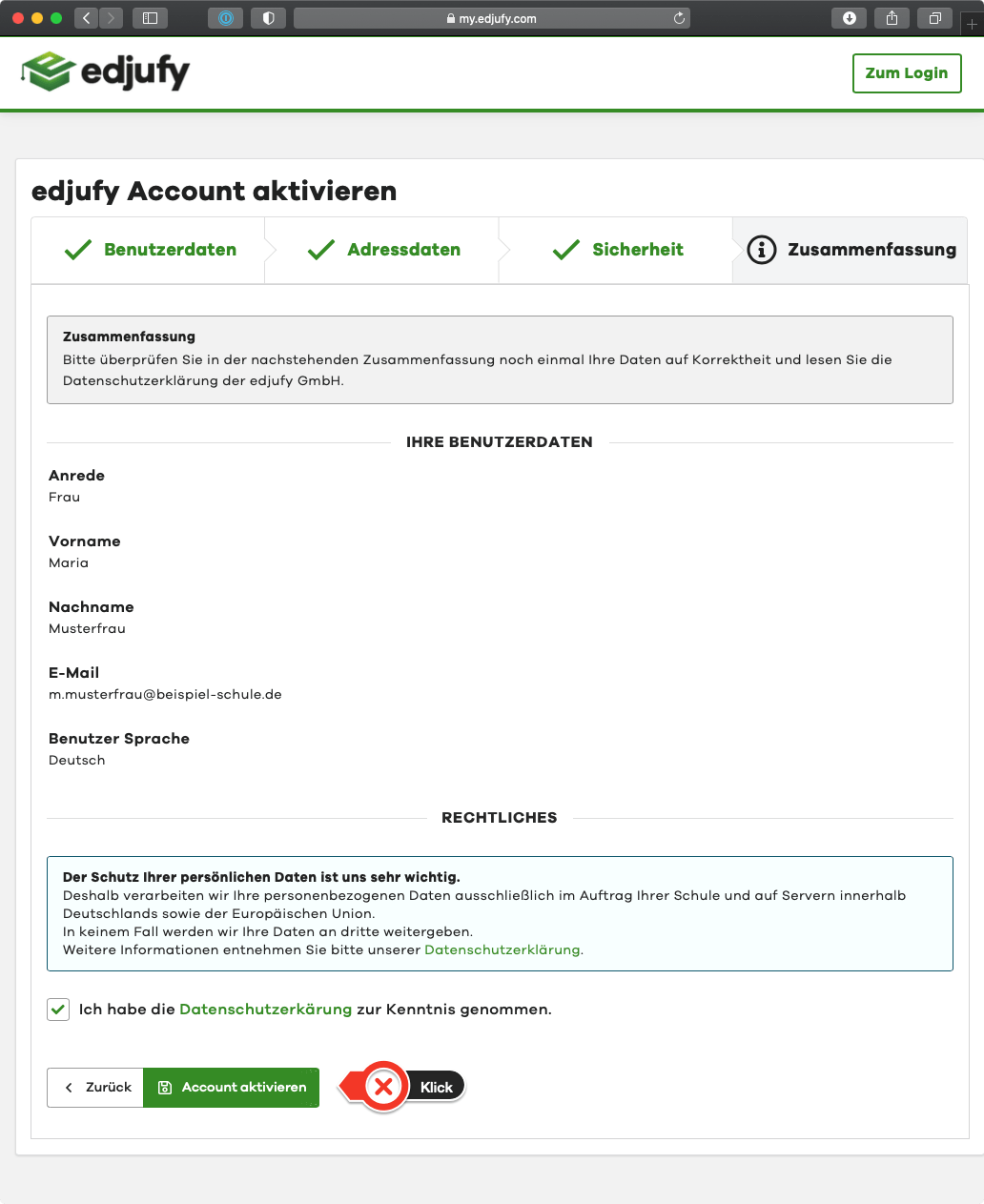 The account activation consists of several individual steps. After you have defined your personal password in the second-to-last step, the account activation is completed in the summary with a final confirmation.