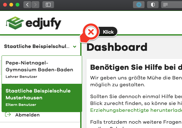 Switching schools is possible directly from within the application without logging in again. If multiple schools are associated with your credentials, you can open the school selection dialog by clicking on the name of the school.