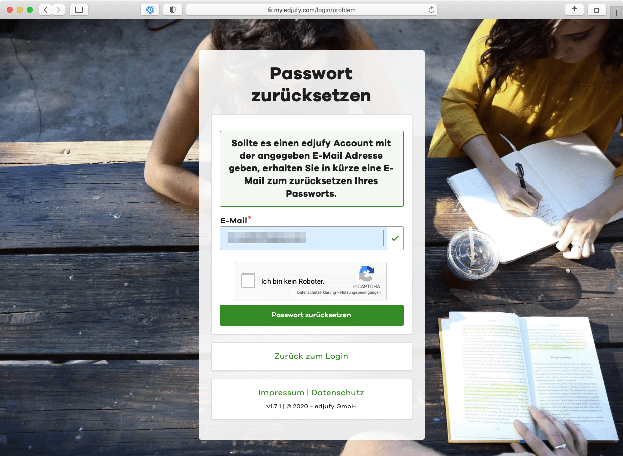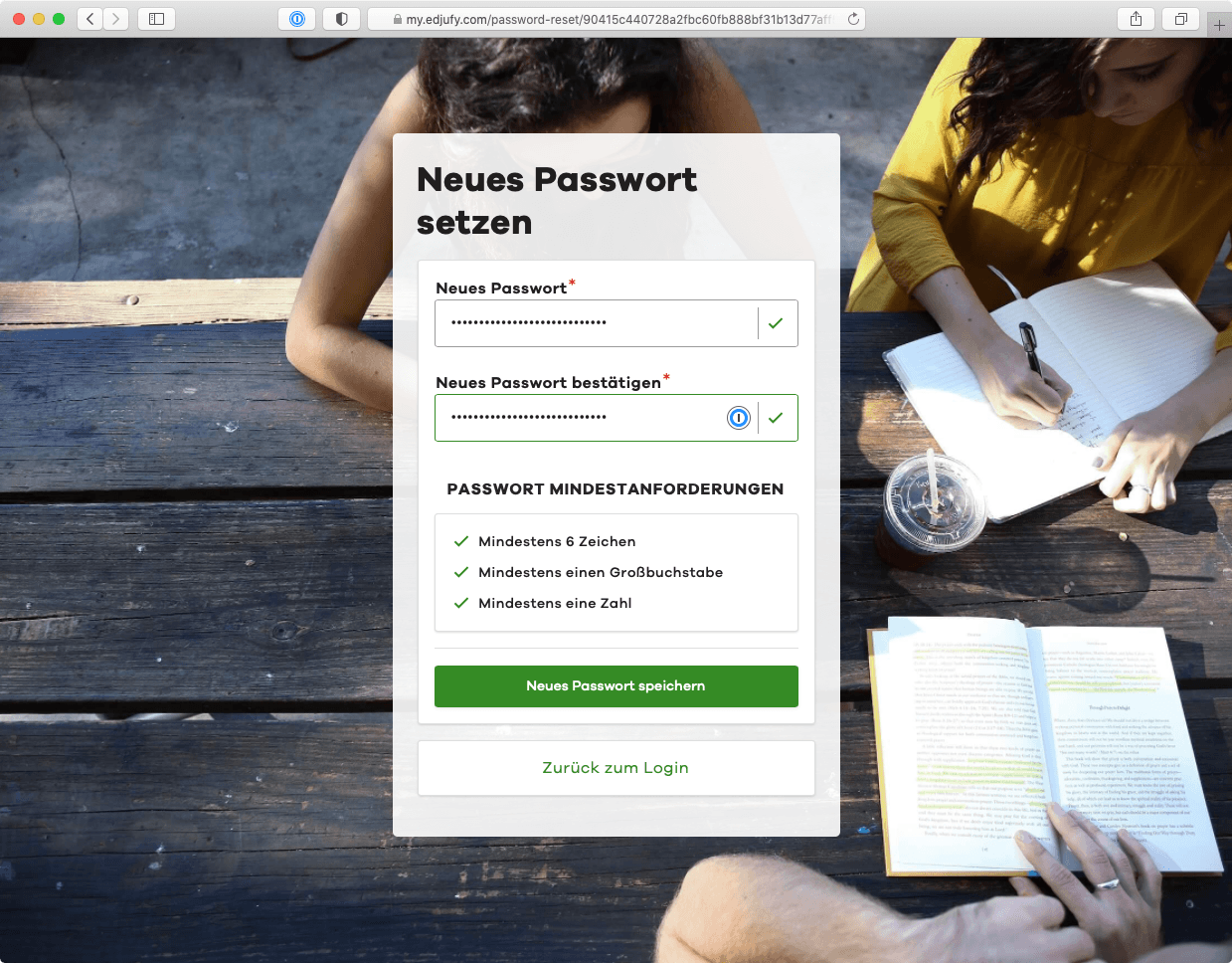 Your password has now been reset and you will receive the following confirmation as well as a confirmation email. From now on, you can log in with your new password as usual at https://my.edjufy.com.