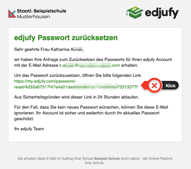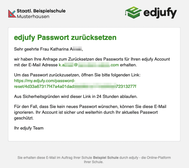 By clicking on the Reset Password button from the previous view, edjufy checks whether an account exists for the registered email address. If this is the case, you will receive a message to this email address with a link to reset the password. This email looks approximately like the following example.