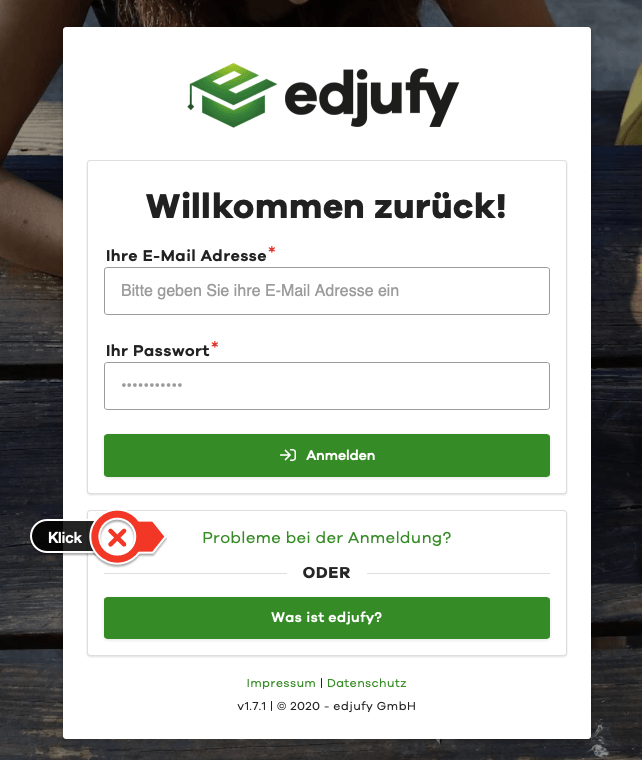 If you have problems logging in or have forgotten your password, the link "Problems logging in?" on the login mask will take you directly to the password reset. If you have forgotten your password, you can reset it at https://my.edjufy.com/login/problem.