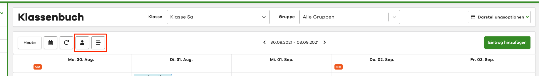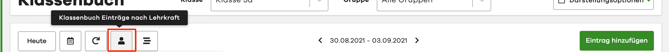 To open the Lesson Log Entries by Teacher view, click on the person icon in the control area of the digital Lesson Log.