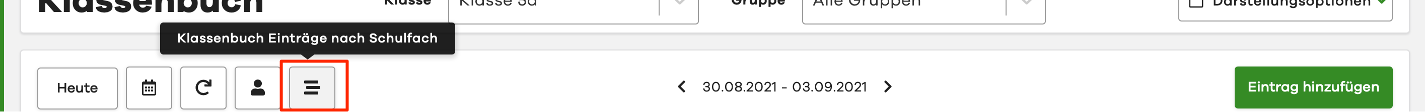 To open the Lesson Log Entries by Subject view, click on the list icon in the control area of the digital Lesson Log and then select a desired subject.