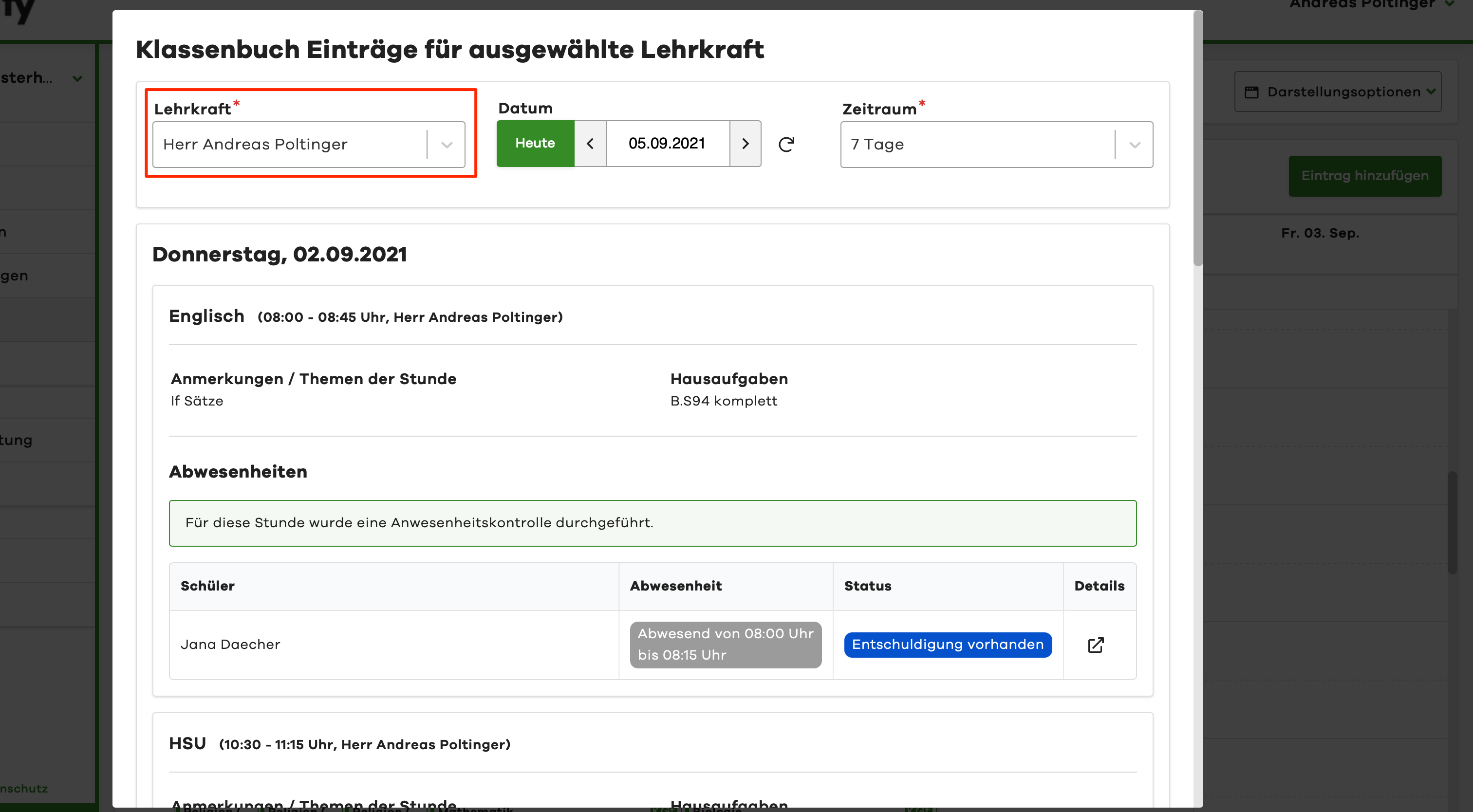 For Lesson Log entries by teacher, the current user is preselected. To see the entries of a colleague, simply select the corresponding teacher in the dialog window at the top.