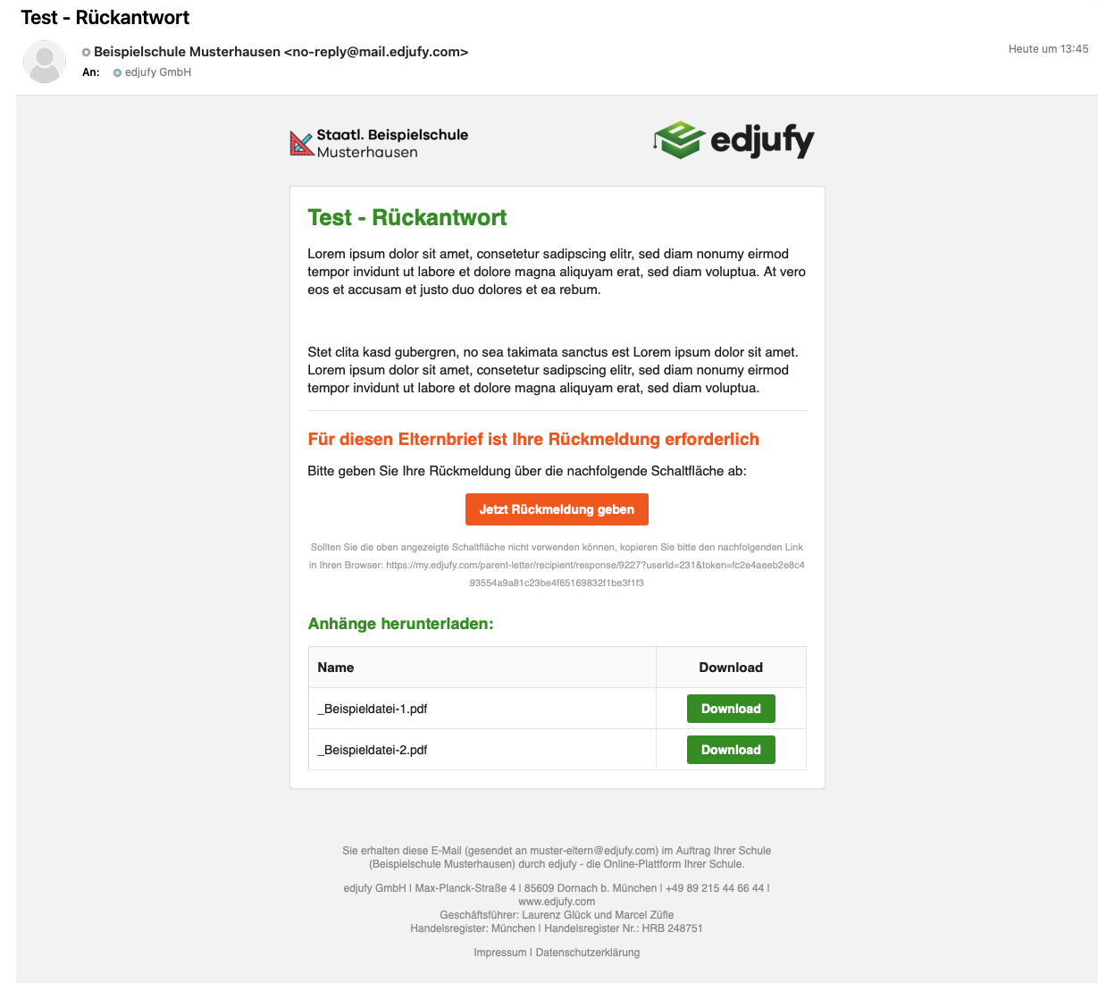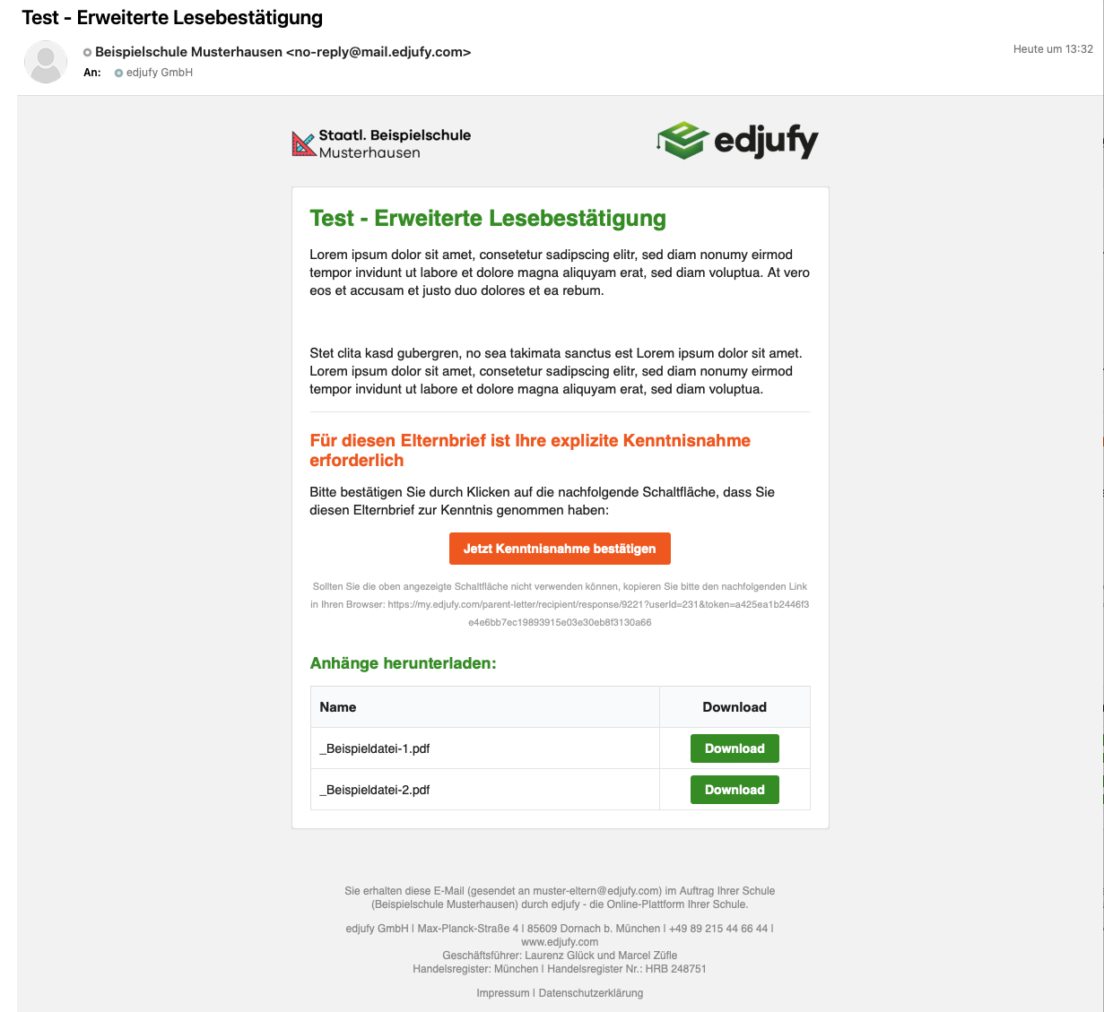The email of a parent letter with Simple Read Confirmation looks approximately like the following example: