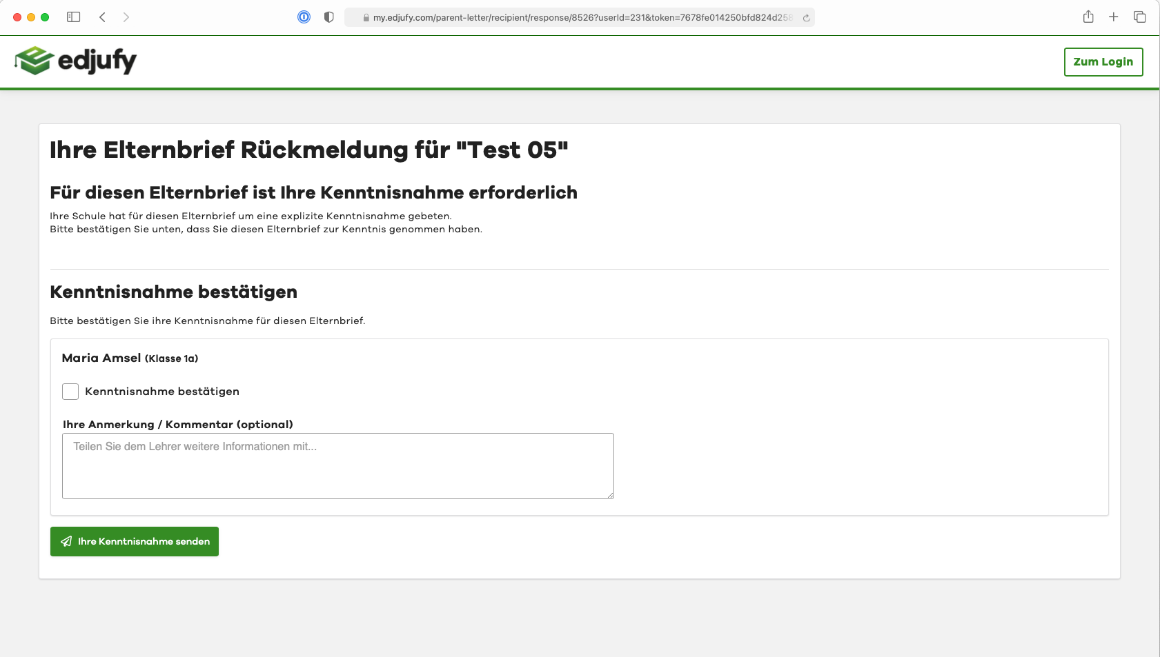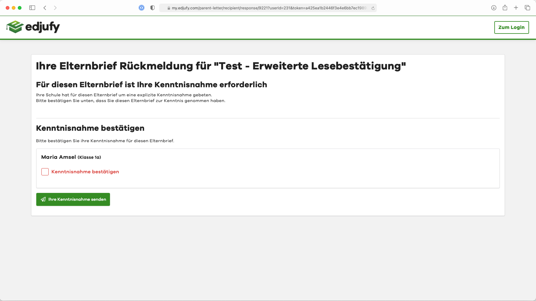 Select this option if you require explicit acknowledgement of your parent letter. The recipients will now be asked to explicitly acknowledge receipt. This variant is comparable to the analogue acknowledgement section.