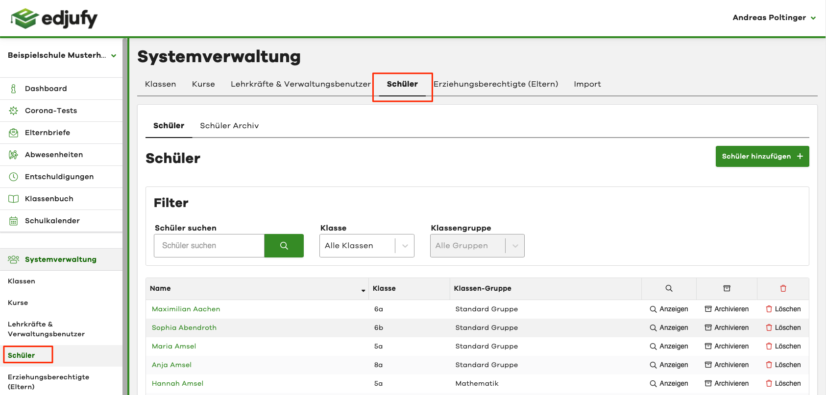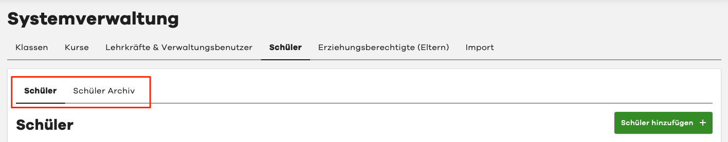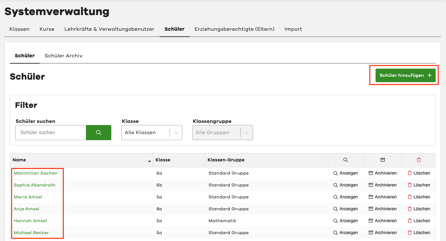 Please click on the menu item Pupils in the System Administration. In the sub-item of the same name Pupils, you can view all previously created pupils. You can view the details of an existing pupil by clicking on the desired name. And with the Add Pupil + button, you can manually create additional pupils.