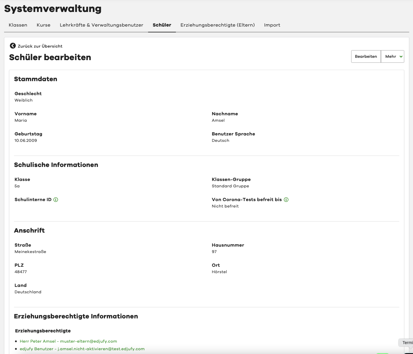 To view or edit a pupil, please click on the name of the desired pupil in the pupil overview as mentioned at the beginning. In the following view, you will see some metadata of the pupil. To edit the pupil, simply click on the Edit button in the upper right corner.