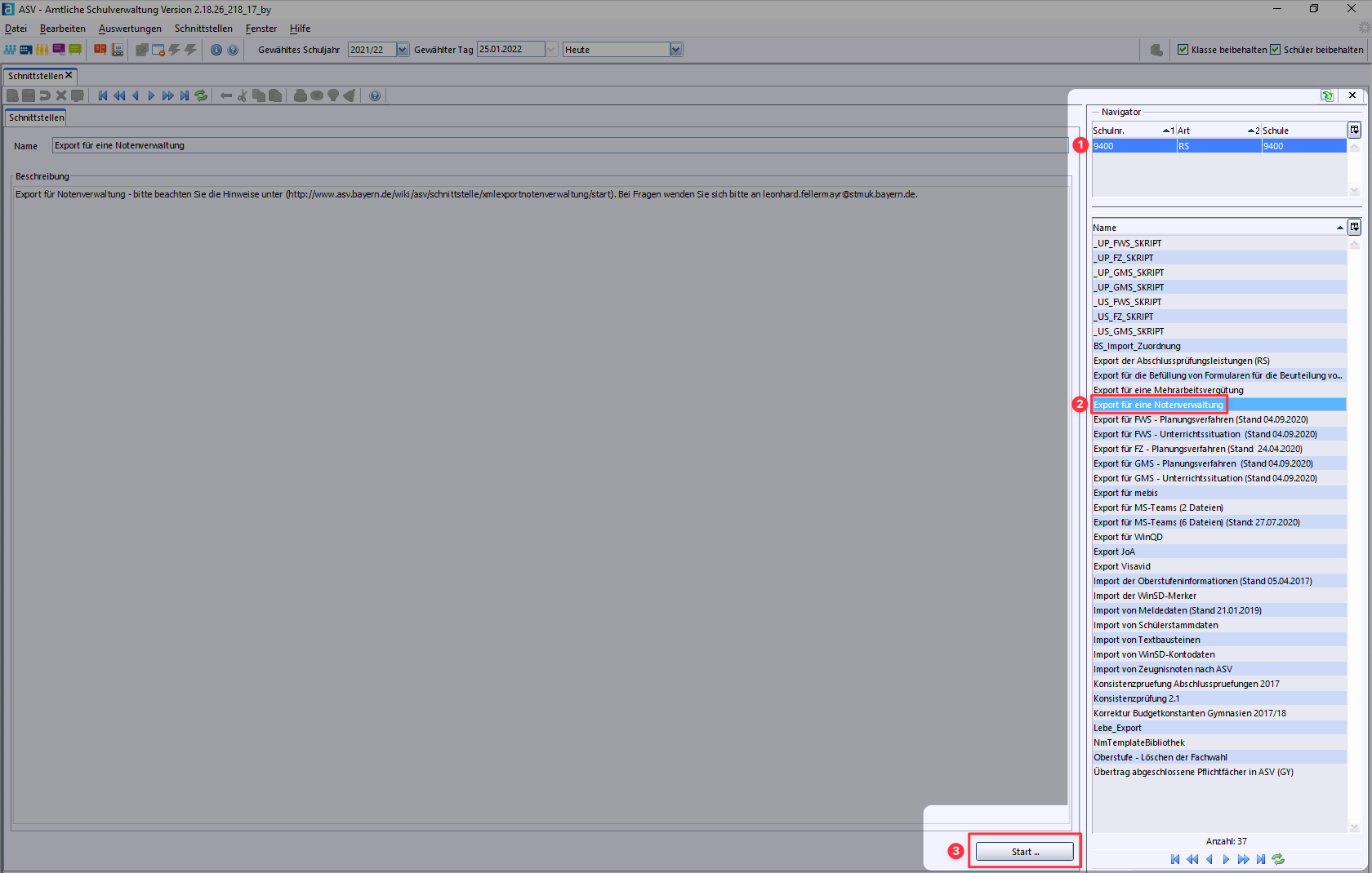 Select your school (1) and then the interface (2) Export for a Grade Management System and start your export with the Start ... button (3).