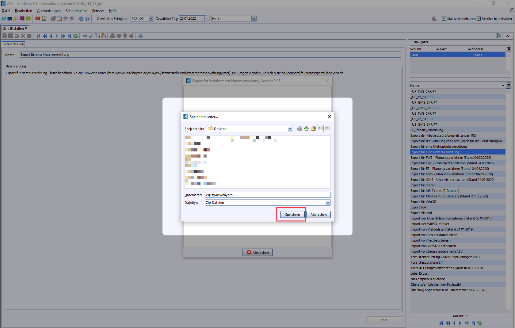 Now select a suitable storage location and a name for the export file. In this example, we save the export under the name edjufy-asv-bayern.zip on the Desktop.