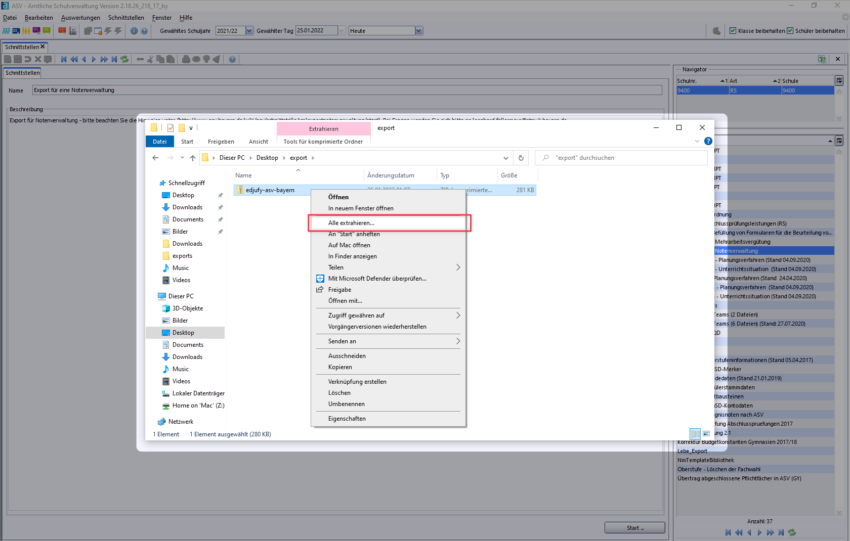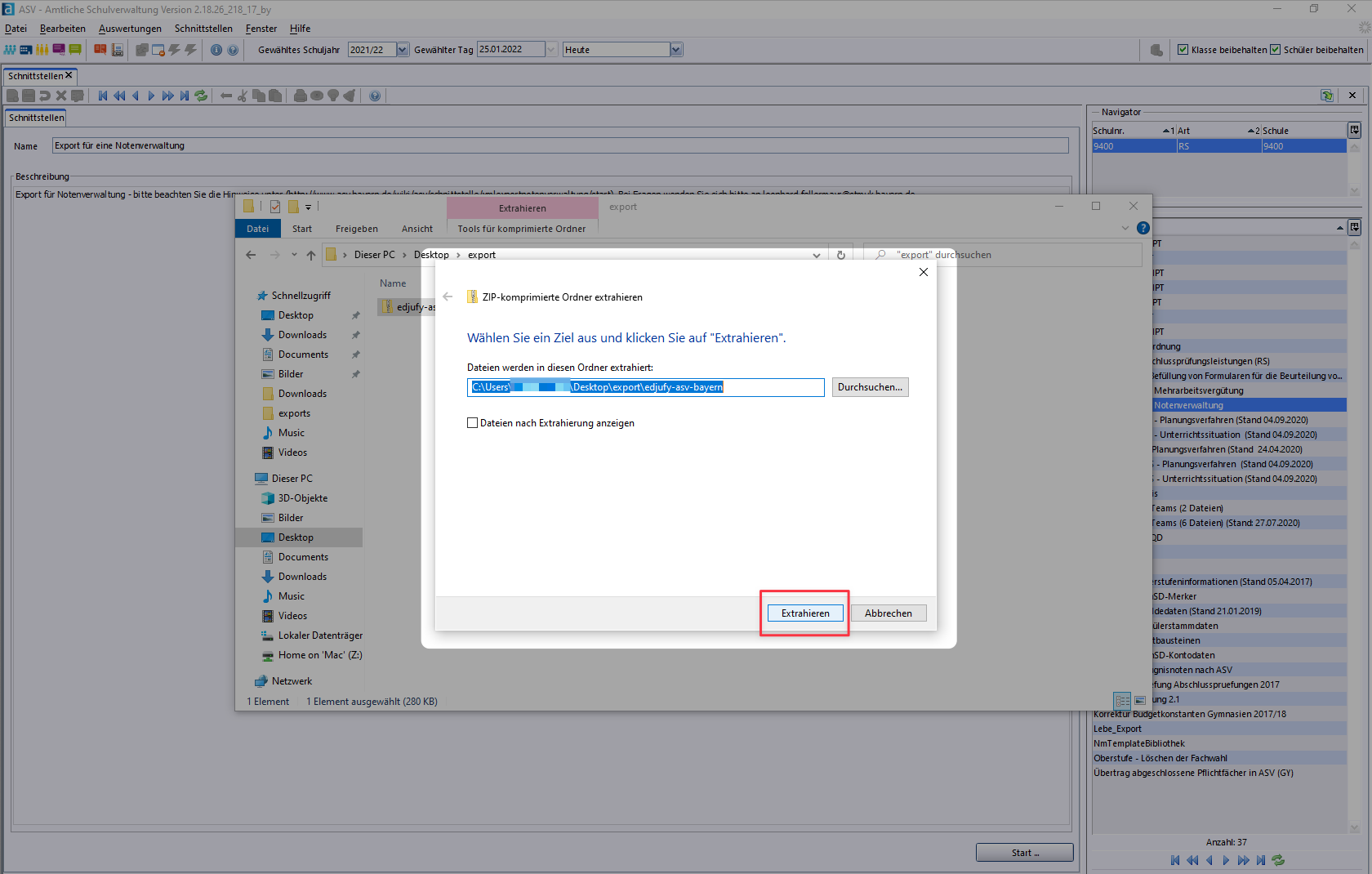 Now go to the folder you previously selected as the export destination and extract the ZIP archive. To do this, right-click on the exported file -> Extract All -> and then click on the Extract button. Now enter the password displayed earlier and your ASV export is ready for transfer to edjufy.