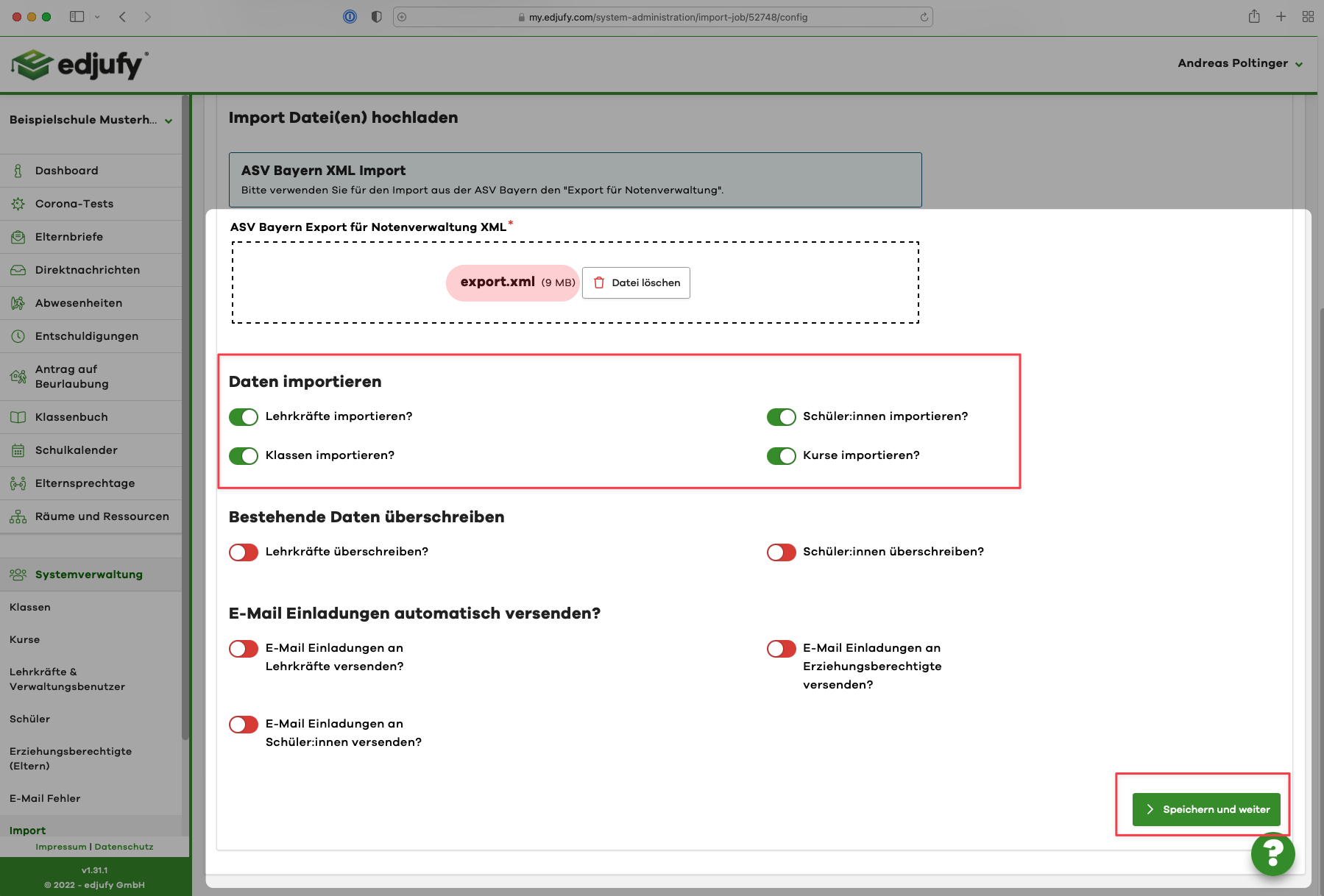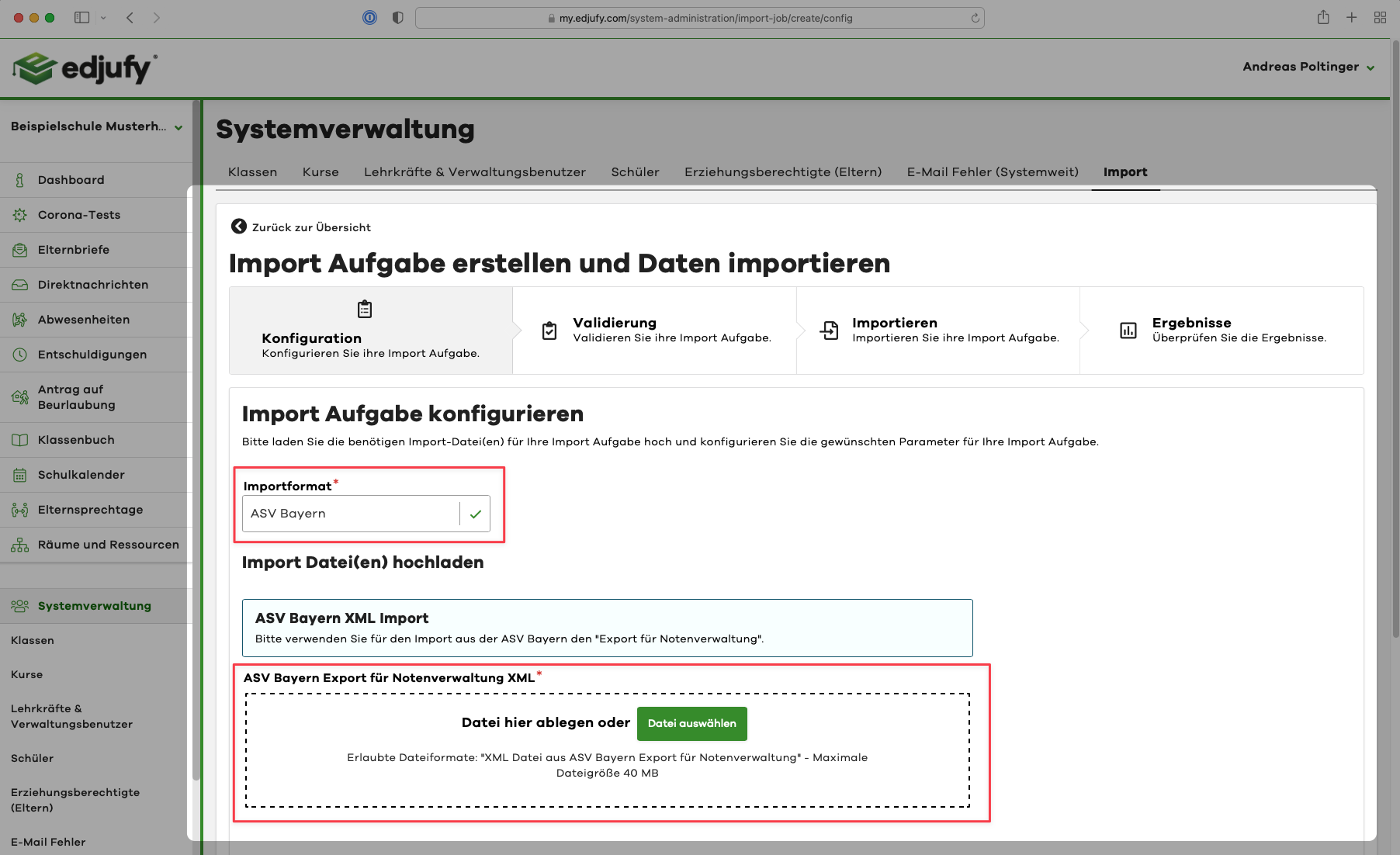 Please select the import format ASV Bayern and upload the previously created ASV XML via our file uploader.